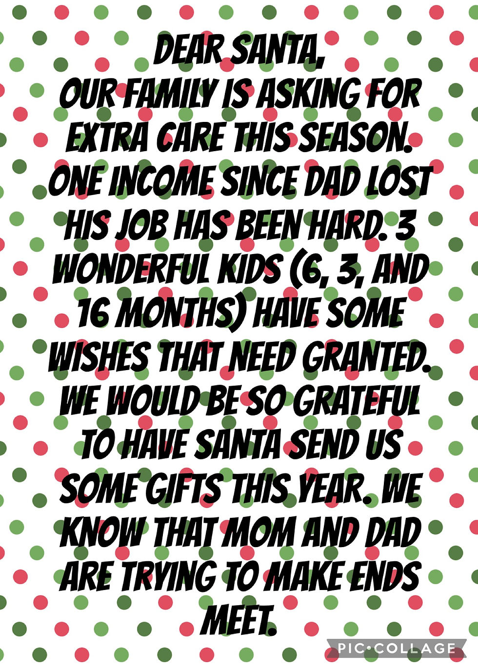 Santa needs a little help this year! We have 3 young kids (6, 3, and 16 months) and one source of income. We work hard to make ends meet, but buying gifts is hardly in our budget. Christmas is a special time and we would greatly appreciate you playing Santa and gifting our children with something special to open Christmas morning and to find in their stockings! Thank you for for considering our family!